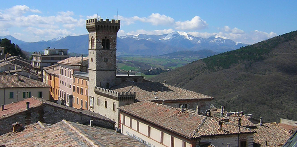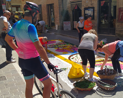 A Filottrano passiamo sotto l’arco d’ingresso al centro storico, che proprio poche settimane fa abbiamo visto addobbato per il passaggio del Giro d’Italia, tanto che sono ancora appesi da una casa all’altra i festoni rosa.