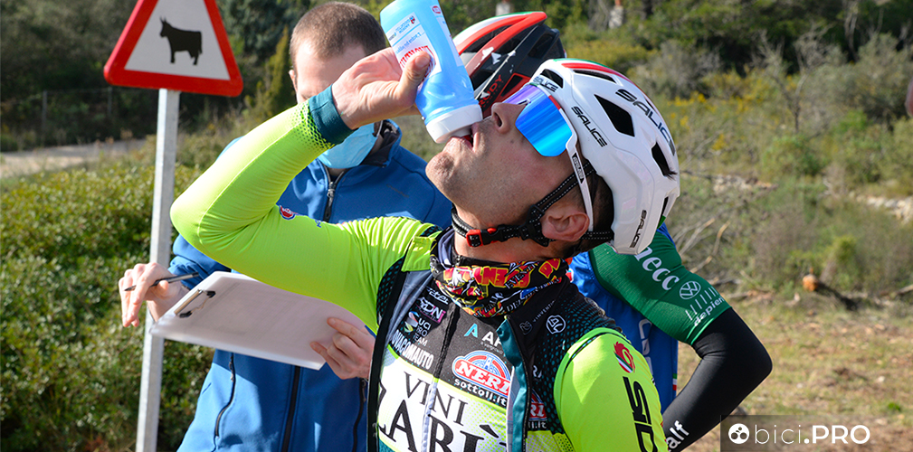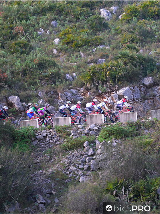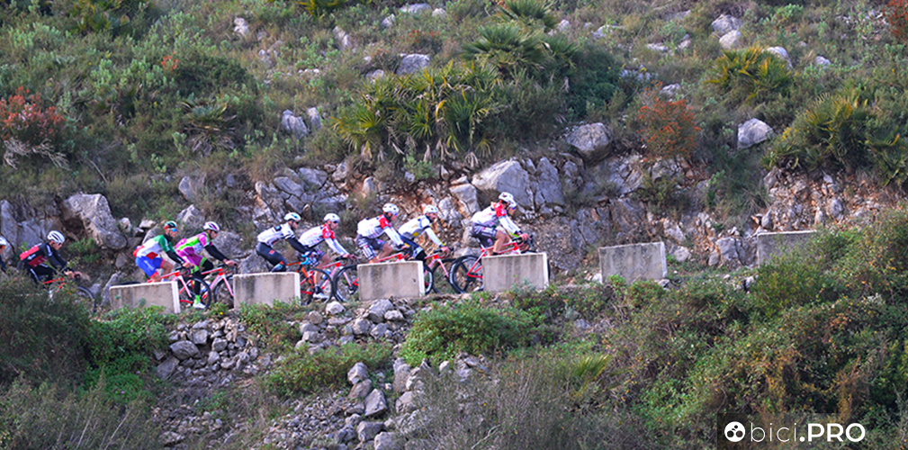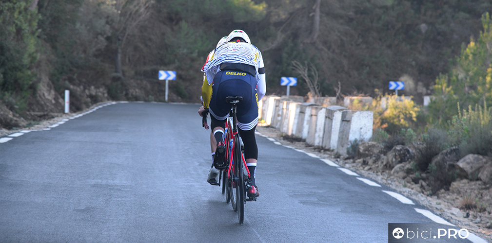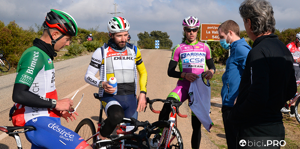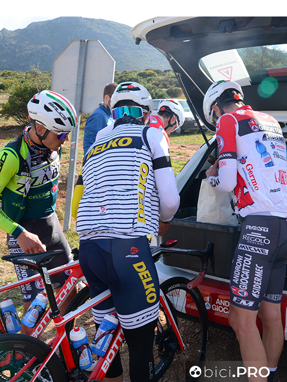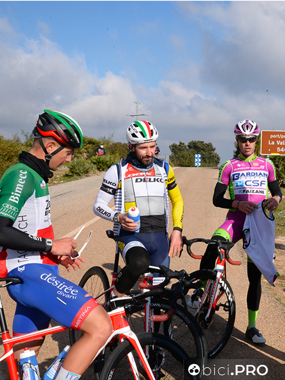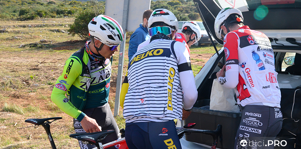 Arrivano sulla cima del Port la Valle d’Ebo, lungo la quale incontriamo i corridori della Eolo fare i test sul lattato. Per qualche secondo ci affianchiamo a Maestri, sudato e rosso in viso. Ricambia il saluto e si rimette a testa bassa.
