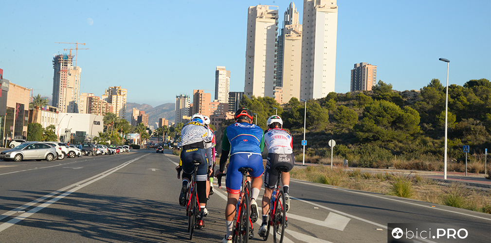 Partenza alle 9,45, con undici gradi, mentre Benidorm si metteva disordinatamente in movimento. All’appello manca soltanto Chirico, reduce da un malanno, che dopo due giorni sui rulli, uscirà su strada per una sgambata.
