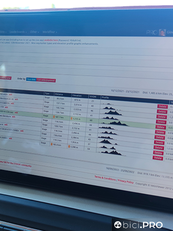Sul cruscotto, il tablet mostra la schermata di VeloViewer: un bel passo avanti rispetto a quando si girava con carte stradali da interpretare e si perdeva la metà del tempo in cerca del giusto incrocio. Il programma giornaliero prevede 185 chilometri con 3.200 metri di dislivello e tre test. Uno dopo 85 chilometri: 15 secondi di sprint in leggera salita. Uno dopo 90 chilometri, con 3 minuti a tutta. Il terzo dopo 110 chilometri, facendo 12 minuti al massimo in salita.