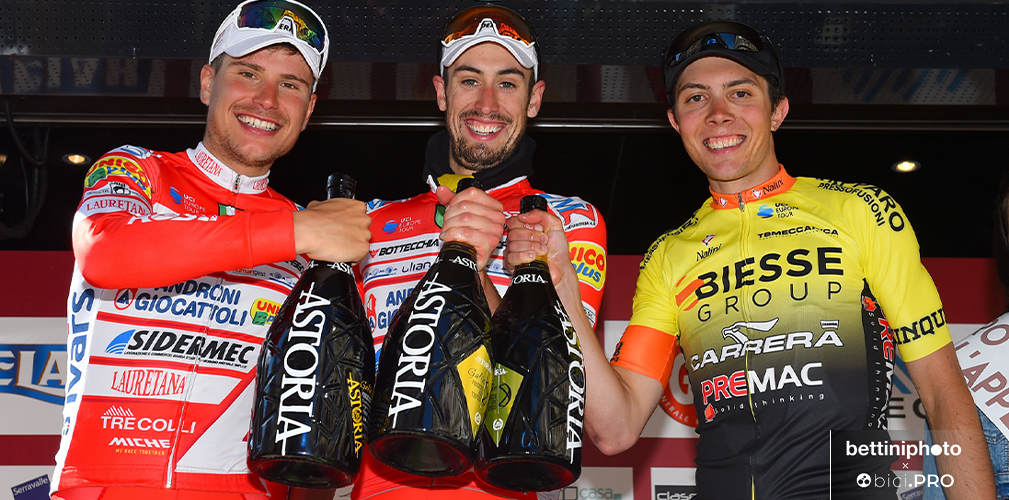 Simone Ravanelli in maglia Biesse Carrera sul podio del Giro dell’Appennino 2019 accanto a Masnada e Cattaneo, al tempo in Androni Simone Ravanelli in maglia Biesse Carrera sul podio del Giro dell’Appennino 2019