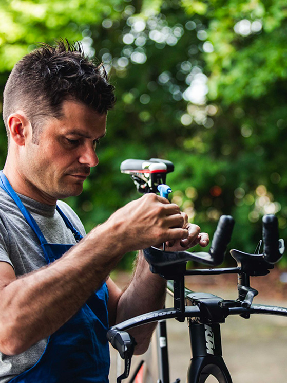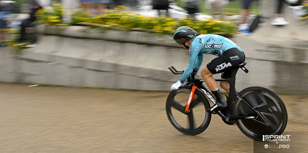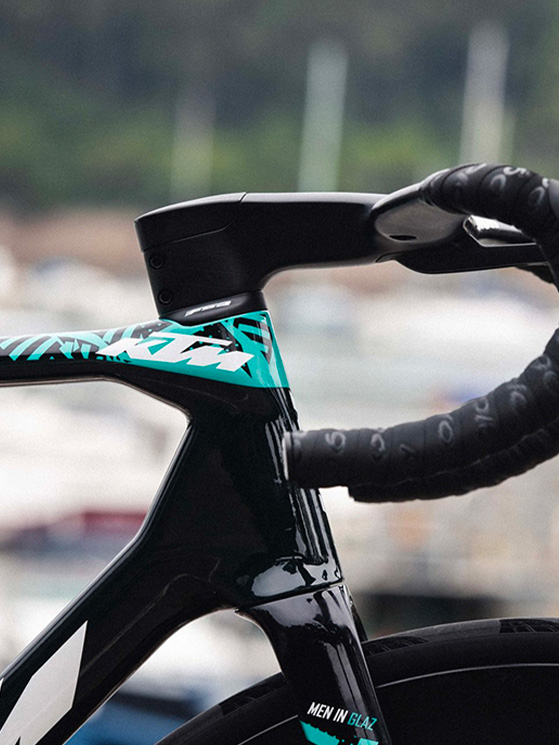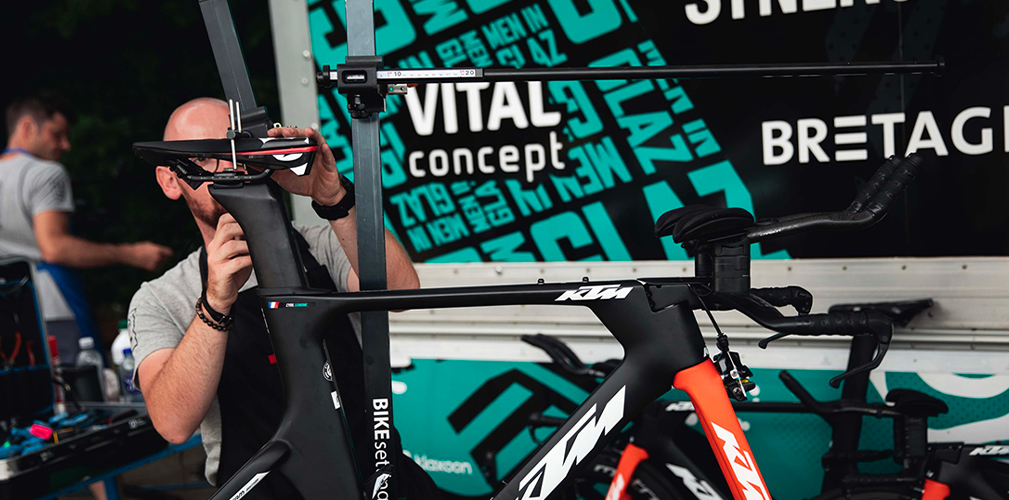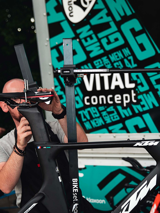 Tutti i dettagli in ordine sulla KTM da crono: la vigilia dei meccanici è trascorsa al lavoro (foto B&B Hotels-KTM) Ultime verifiche delle misure. Mozzato ha il busto più lungo del cavallo, pedala allungato (foto B&B Hotels-KTM) Da oggi debutterà al Tour la nuova Revelator Alto, più aerodinamica (foto B&B Hotels-KTM)