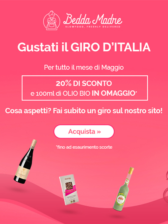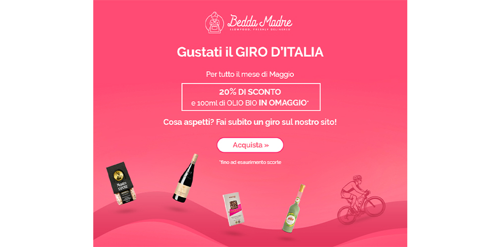 All’interno del nostro gruppo siamo tutti sportivi. E poi io personalmente il ciclismo lo vivo quotidianamente in famiglia… In casa è una vera passione. Bedda Madre esalta i prodotti ed i piccoli produttori italiani, e così – proprio in coincidenza con il Giro d’Italia – abbiamo deciso di riservare una promo speciale dedicata a tutti i lettori di bici.PRO che si registreranno sul sito www.beddamadre.com. A loro verrà immediatamente offerto uno sconto del 20% sull’acquisto ed in omaggio riceveranno anche una bottiglia di olio d’oliva Bio da 100 ml. Ma bisogna far presto perché questa promozione è valida per il solo mese di maggio, quello appunto del Giro d’Italia, e fino ad esaurimento scorte.