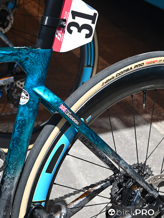 Il velocista dell’Isola di Man, famoso anche per la sua pignoleria in ambito tecnico e dei materiali, utilizza una Filante SLR, bicicletta che avevamo già presentato durante l’inverno. Rispetto ad allora vediamo delle ruote Hed con predisposizione tubeless, gommate proprio con l’ultima versione dei Vittoria Corsa TLR da 28. Il frame-kit, valutando il primo impatto estetico, sembra essere quello standard, ma nessuno ci vieta di immaginare ad una costruzione fatta ad hoc e su richiesta specifica dello stesso Cavendish.