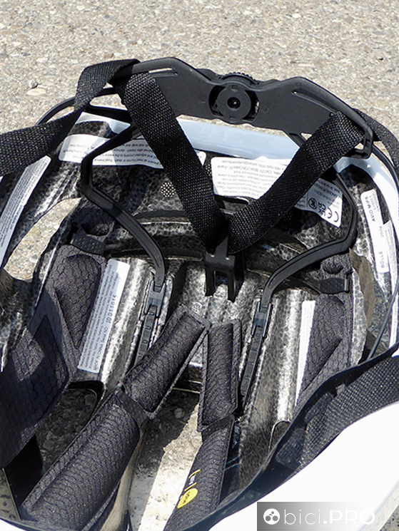 Non ha punti di pressione particolari, anche se il casco “si sente” e non dà mai la sensazione di scappare via. L’imbottitura frontale è un pezzo unico, fa parte del concetto Mips Air e aiuta a regolare la taglia quando si aziona la rotella posteriore, ma è abbondantemente scaricata in molte sue parti e non accumula sudore.
