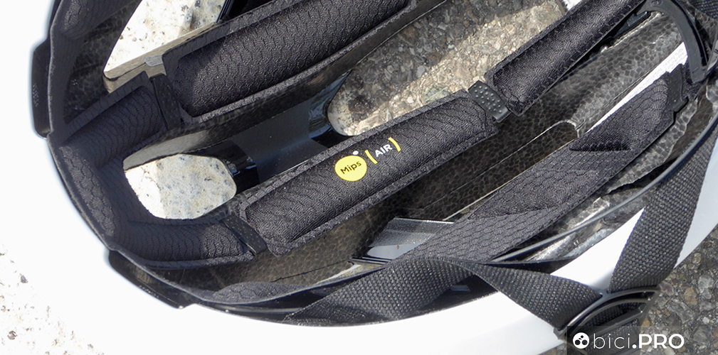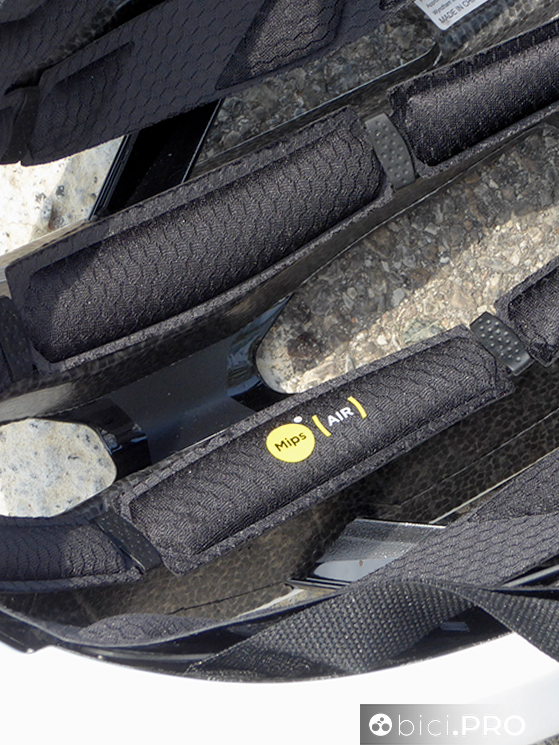 E poi c’è il Mips Air, quello integrato nelle imbottiture, che aumenta ulteriormente di 1,5 centimetri lo slittamento del casco in caso di colpo proibito. Non c’è la gabbia gialla applicata tra le imbottiture e l’interno, perché sono le stesse imbottiture ad integrare e sostenere il Mips. Si risparmia peso e non viene sacrificata la sicurezza, si riduce la superficie del casco a contatto con la testa; il comfort ne guadagna.