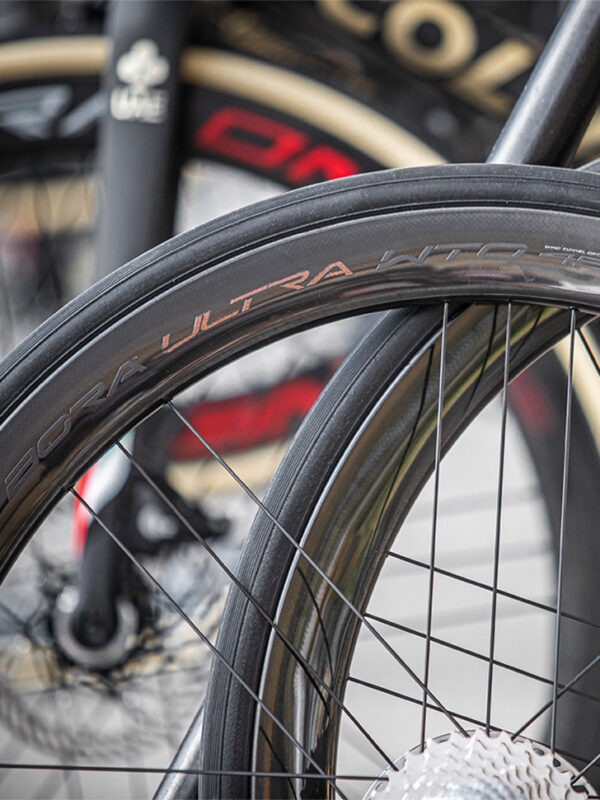 Il sistema di raggiatura è il G3, timbro di riconoscimento dell’azienda vicentina. Quest’ultimo offre un ottimo trasferimento della potenza, aspetto utilissimo per Pogacar, e migliora la frenata. I mozzi sono realizzati con materiali diversi: quello anteriore in carbonio e quello posteriore in alluminio. Questa scelta permette di equilibrare le differenti forze che agiscono sul sistema ciclico delle ruote dato che quella anteriore presenta il freno a disco e quella posteriore anche il corpetto integrato. I cuscinetti all’interno dei mozzi invece si avvalgono della Ceramic Ultimate Level Technology (CULT) e presentano una flangia più stretta in grado di migliorarne la scorrevolezza.