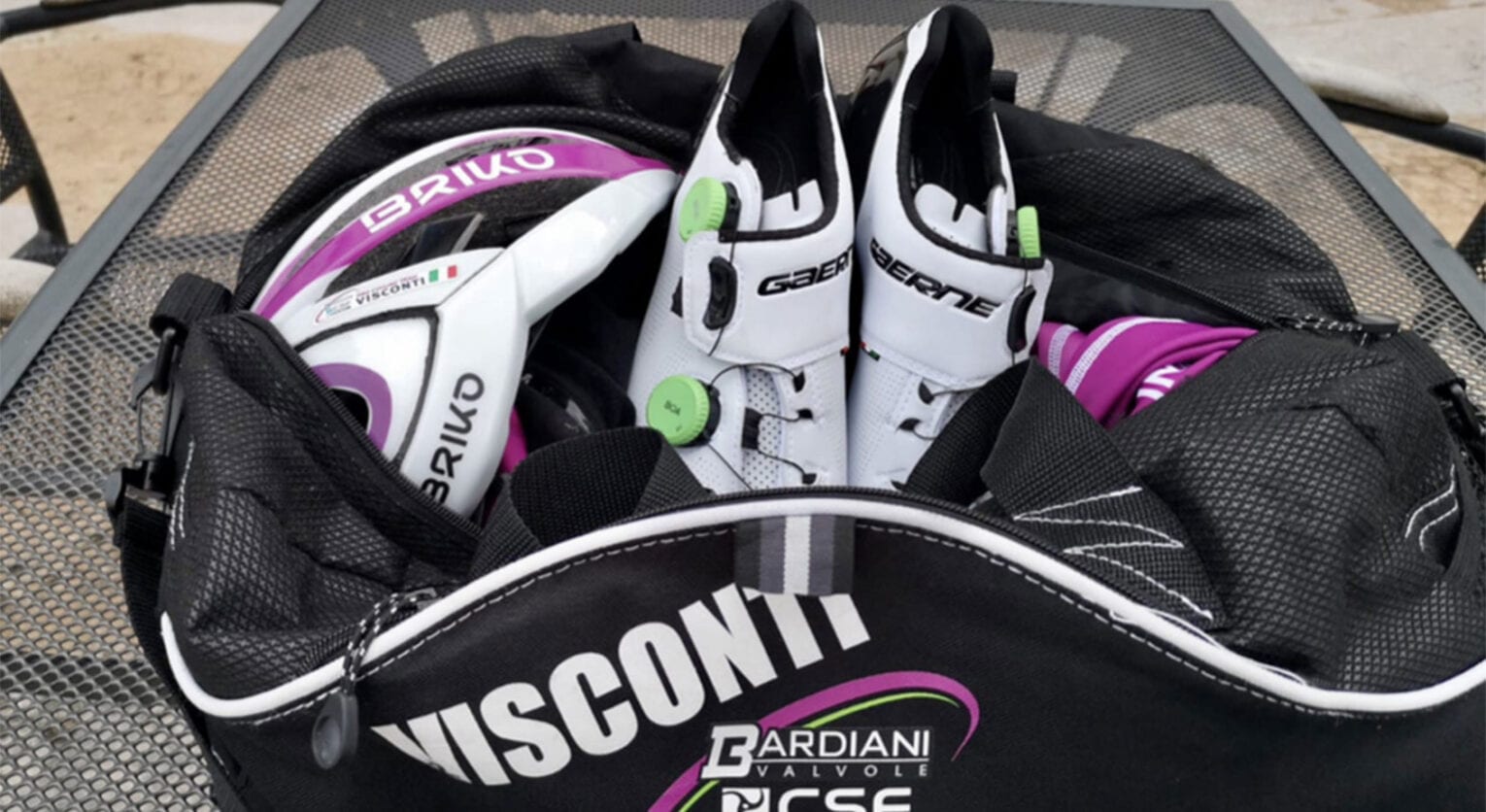 Di cosa si tratta? Nei portabagagli delle ammiraglie sopra a ruote e frigo portatili ci sono tante borsette, tipo portascarpe ma un po’ più grandi. Sopra c’è stampato in grande il nome del corridore e dentro c’è la “salvezza”.  Cosa ci si mette? Ce lo spiega Giovanni Visconti, uno dei veterani del gruppo.