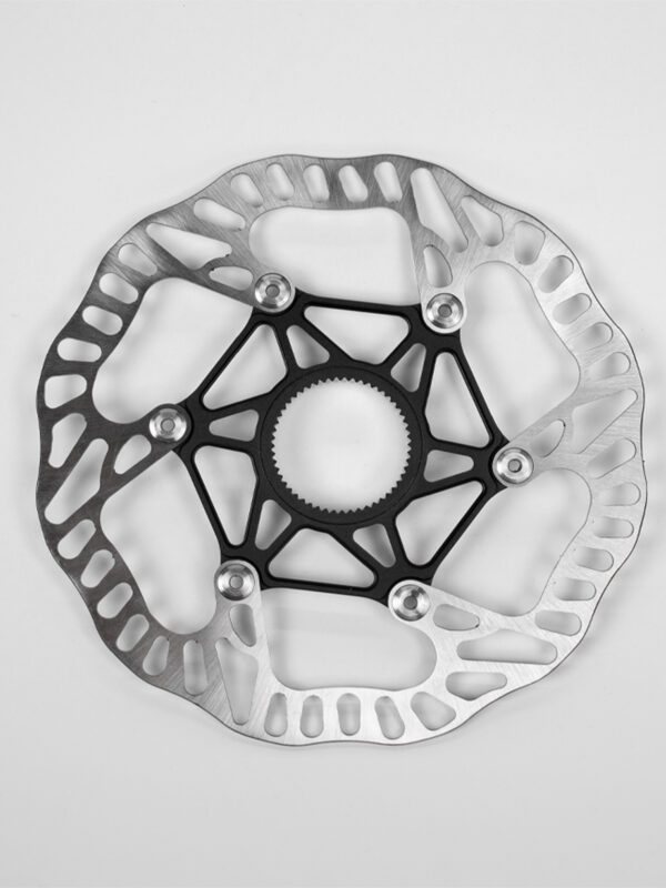 Non c’è carbonio, il ragno è in alluminio e la pista frenante è in acciaio temprato con la tecnologia ad induzione. Una delle particolarità è la presenza di creste a sezione rettilinea, sono forate ed aumentano la dissipazione termica. Il calore, uno dei grandi nemici degli impianti frenanti a tutti i livelli. BrakeForce può essere un componente gamechanger? Li abbiamo provati.