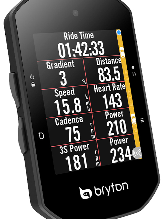 Lo schermo è di qualità LCD, anti-riflesso, a colori. Come tutti i bike device Bryton adotta tutti i supporti satellitari. GPS e GNSS, Glonass e Galileo, i cinesi BeiDou, i giapponesi QZSS. La qualità della ricezione satellitare Bryton è confermata ancora una volta su questo modello. Quando è acceso bastano pochi secondi (anche senza sensore della velocità) ed è pronto per l’attività. Inoltre è molto sensibile alle ripartenze. In un amen si riattiva dopo una pausa/stop. Si possono pianificare allenamenti mirati e c’è la funzione Climbchallenge 2.0 per monitorare la performance in salita (che si attiva anche senza mappe precaricate).
