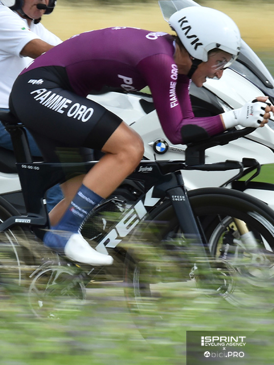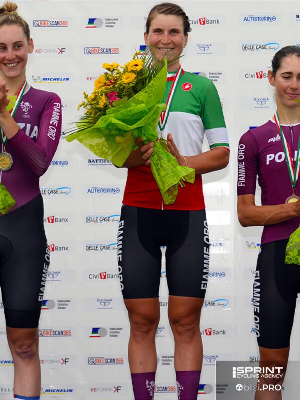 Le 16,06, facciamo un passo indietro. Guazzini è scocciata, come sarebbe chiunque perdesse un campionato italiano per meno di un secondo. Ha lasciato la zona del podio per andare a prendere il necessario per cambiarsi, anche se quando torna indossa ancora il body delle Fiamme Oro. Se Elisa Longo Borghini non ne fosse uscita, il podio al completo avrebbe i colori granata della Polizia di Stato.