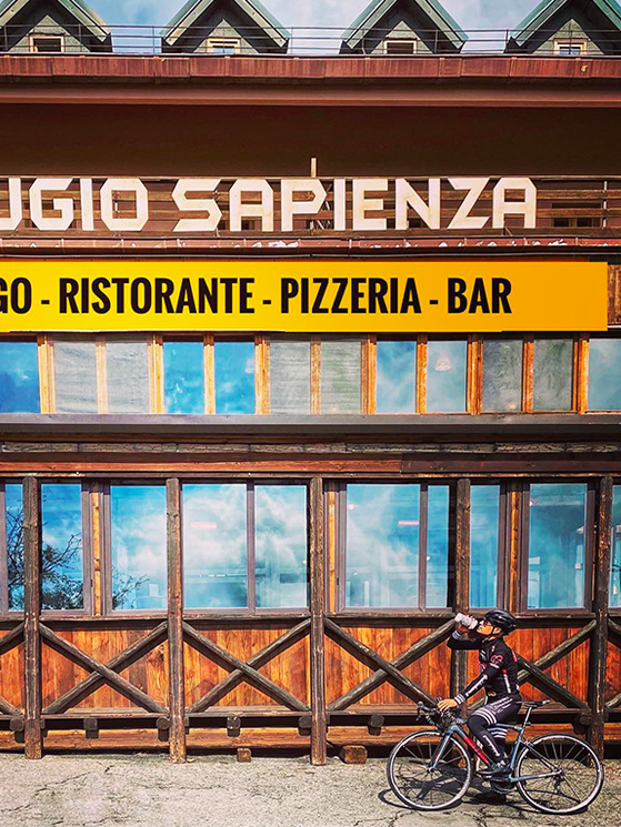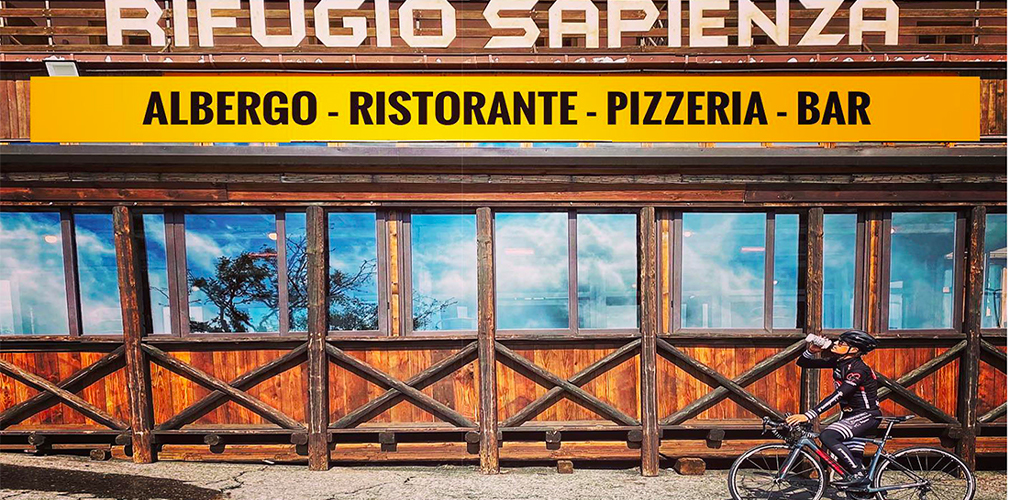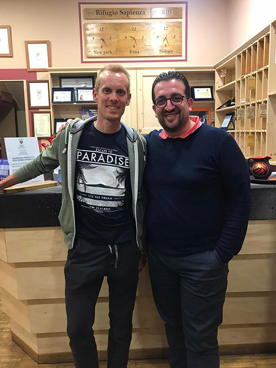 Domenico Moschetto: si chiama così il gestore del rifugio catanese (in apertura con Damiano), conquistato al ciclismo dal lento lavorìo di Paolo Alberati e dall’afflusso ormai regolare di corridori da ogni parte del mondo. E se nel mondo dello sport il Sapienza è una meta gettonata anche per atleti di altri sport, il merito è anche il suo per aver spalancato le porte a una clientela diversa dal solito.