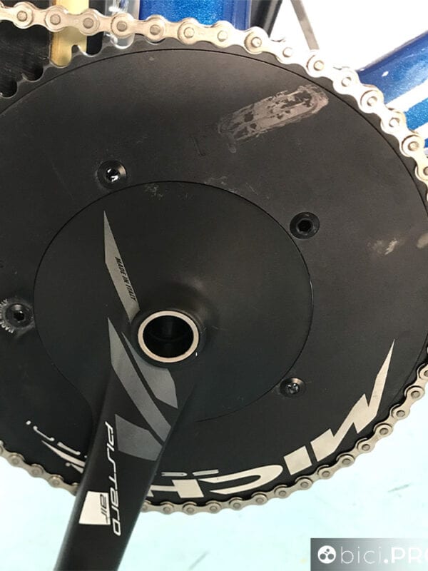 Rispetto alle bici da strada, quelle su pista hanno una catena decisamente più massiccia: è più larga e le maglie sono più robuste. Come i pignoni del resto. Il perché è presto detto. I pistard scaricano sui pedali una forza enorme e lo fanno in modo violento, specie nelle partenze. Inoltre il rapporto è fisso, non c’è bilanciere che possa “attutire” tensioni maggiori. Pertanto la trasmissione deve essere “robusta” e affidabile. Quando nelle partenze arrivano quelle frustate da 1800 watt devono resistere e trasmettere al meglio l’energia.