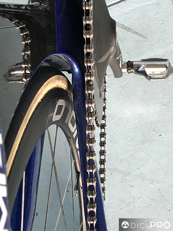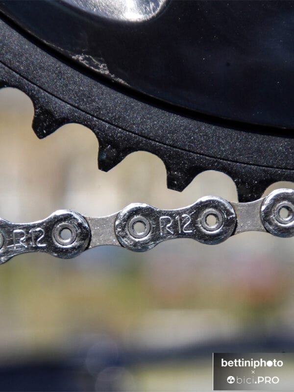 Oggi, con il fatto che spingono rapporti lunghi, specie i capitani, tendono a tenere sempre il 53, o comunque la corona grande, anche in salita e sfruttano dietro tutta la scala, pertanto la catena lavora storta. E con i chilometri si “apre” di più rispetto ad un ciclista normale. Di solito le catene sono garantite per circa 4.000 chilometri, ma come detto dopo una settimana di gara le leviamo per precauzione. I gregari, che magari in salita non devono tirare le trattano meglio, mettono il 39 e la catena lavora più dritta.