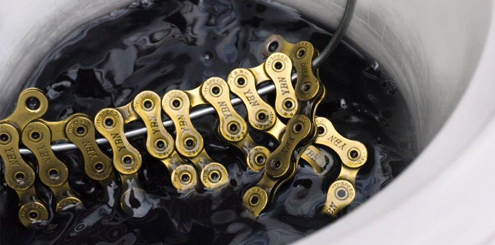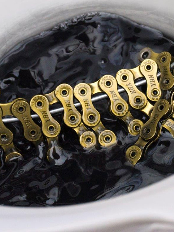 Utilizzando la cera a caldo, ma il procedimento ideale è laborioso. La catena viene prima sgrassata, poi messa a bagno nella cera fusa. Ne viene estratta prima che la cera si solidifichi e poi fatta funzionare per un’ora. A quel punto viene passata nel solfuro di Tungsteno, che ha grandi proprietà antiattrito. Pare che con una catena così trattata, ci sia un risparmio da 6 a 8watt, che per un amatore magari sono pochi, ma per un professionista e in epoca di marginal gains sono un bel gruzzolo.