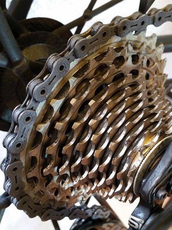 Una catena sporca ed annerita: immagine che si vede spesso al termine di tappe piovoseUna catena sporca ed annerita: immagine che si vede spesso al termine di tappe piovose