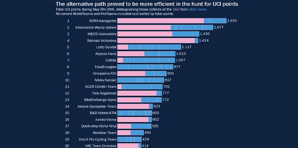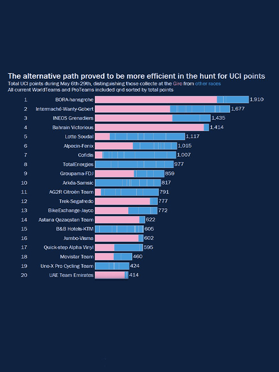 I piani e i conti si fanno, si fanno… Quest’anno magari la distanza tra le prime due, quindi noi e la Jumbo, e la terza era veramente abissale e magari abbiamo fatto qualche conto in meno. Nel mezzo invece tutto è più complicato. E si fanno perché poi questa classifica a squadre sta diventando importante… come è giusto che sia. Il ciclismo è uno sport di squadra, poi vince uno solo, ma è la squadra che gli mette a disposizione tutto il necessario per farlo. E finalmente tutto ciò viene riconosciuto. Questa classifica non è più solo l’elenco delle migliori 18 squadre che possono restare nel WorldTour. Il fatto di essere la prima, di stare sul podio o tra le prime dieci diventa un punto di prestigio e importante leva da presentare poi agli sponsor.