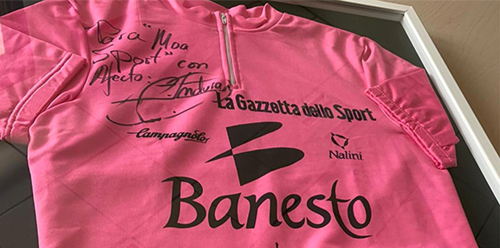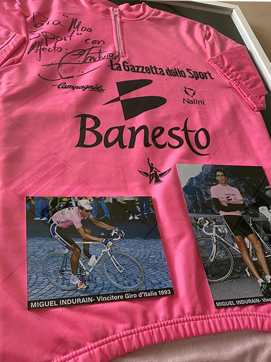Claudio Mantovani, titolare di Nalini, premia Attilio Viviani al Memorial Mantovani 2019 Marco Pantani e la Carrera, qui nel 1995: un altro orgoglio Nalini Miguel Indurain e la Banesto vestivano Nalini: qui la dedica sulla maglia rosa (foto Facebook/Nalini)
