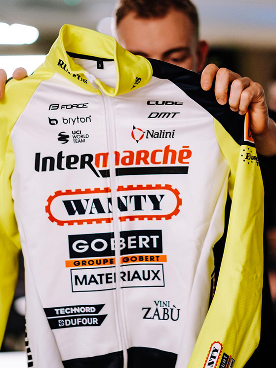 Per Pozzovivo la maglia della Intermarché-Wanty-Gobert (foto Facebook/Nalini) Nella Intermarché corrono altri tre italiani: Petilli, Rota e Pasqualon (foto Facebook/Nalini)