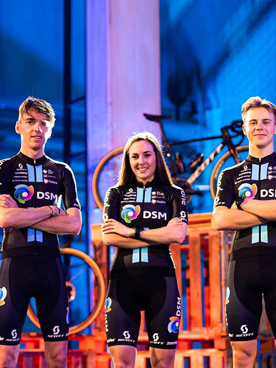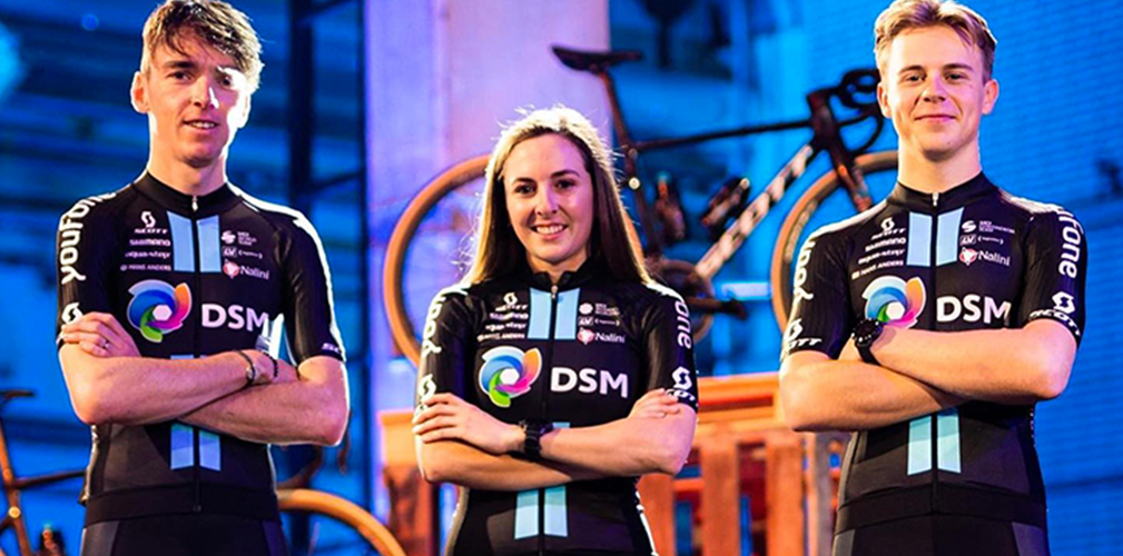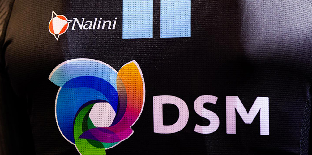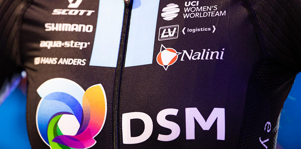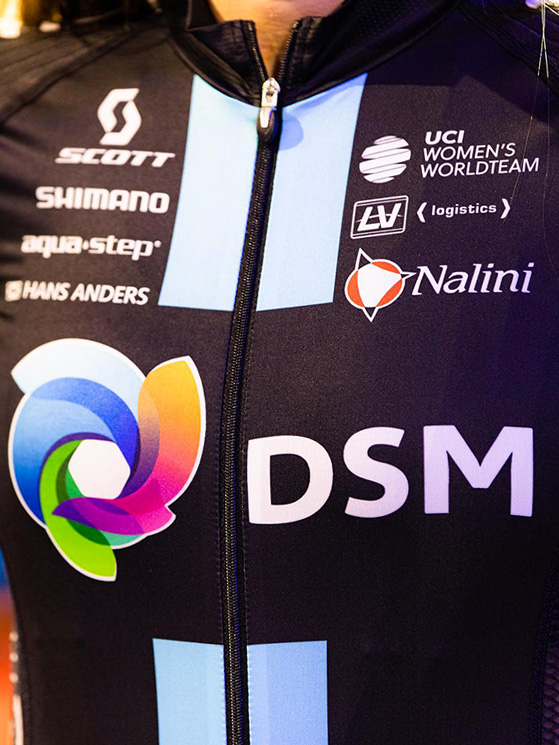 Il Team DSM ha fornito lo stesso materiale a tutti i suoi atleti, in ogni categoria (foto Facebook/Nalini) Eccola maglia del tem femminile: la differenza è nel logo UCI (foto Facebook/Nalini) Il Team DSM è entrato nella scuderia Nalini alla fine del 2021 (foto Facebook/Nalini) La disposizione dei marchi è una delle fasi di maggior studio (foto Facebook/Nalini)