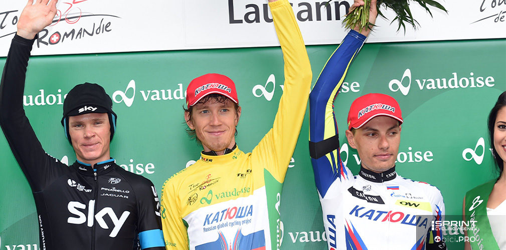Il’nur vincitore del Romandia nel 2015, sul podio con Froome in maglia Sky
