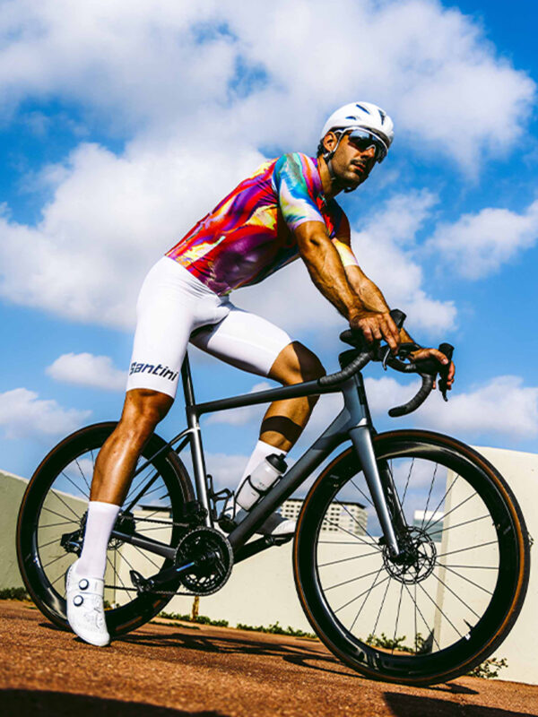 I pantaloncini Unico erano già presenti nella collezione di Santini, ma la novità dell’estate 2025 sono i colori. Ai già presenti nero, blu navy e burgundy (una sorta di bordeaux scuro) si aggiunge infatti un classico bianco, ma con un dettaglio all’avanguardia nelle bretelle. Tutta l’area interna superiore ha una grafica multicolor dal sapore psichedelico.