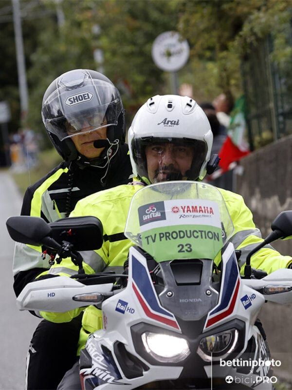 No. Noi entriamo in diretta solitamente alle 15, magari in altre tappe possono cambiare gli orari. Ma in base all’inizio della diretta prendo la tabella oraria del Garibaldi (il librone del Giro su cui c’è TUTTO, ndr) e con il motociclista arriviamo un po’ prima nel punto dove passerà la corsa e nell’orario stabilito. Mi cambio ed entro in gara.