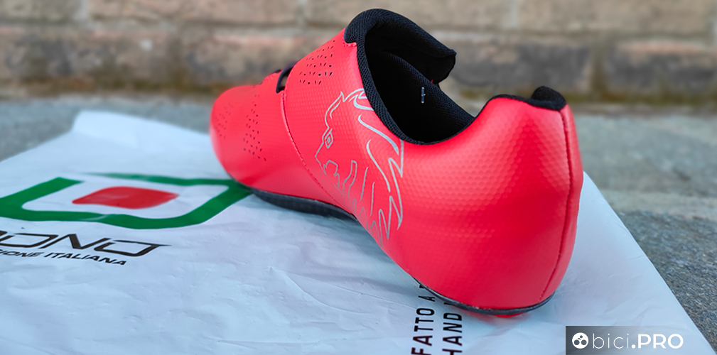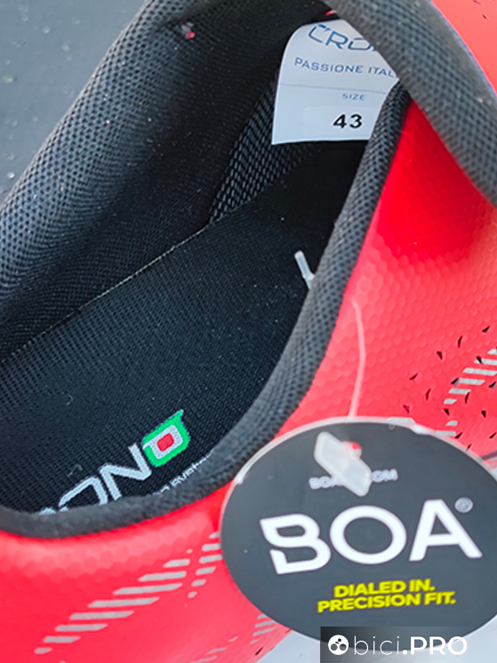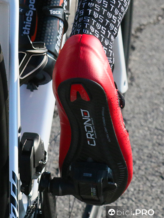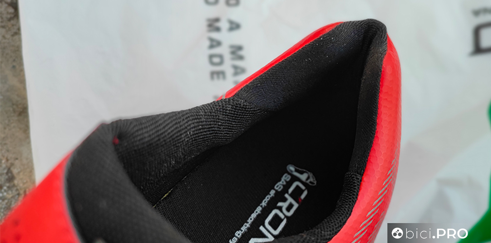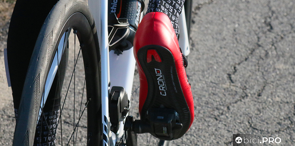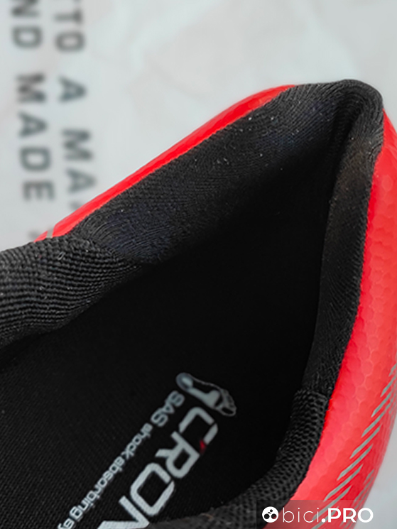 Molto interessante la soluzione adottata da Crono per l’abbinamento tomaia/chiusura proprio in questo punto (vicino al collo del piede), dove è prevista la fascia di chiusura, ma la tomaia è scaricata nella zona a contatto con l’estremità corporea. La soluzione risulta utile perché evita l’accumulo di sudore e calore. Di seguito arricchiamo l’articolo con i feedback di Davide Rebellin.