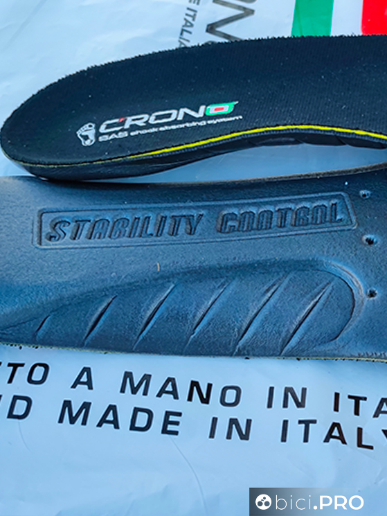 E’ sviluppata sulla base delle Solestar. Crea un giusto supporto, evita la pronazione, senza essere “invadente”, ma è anche dissipante nei confronti delle micro-vibrazioni. Ha uno strato interno che ha l’obiettivo di bloccare e stabilizzare. Il comfort su tutto, perché la Crono CR1 2022 è una calzatura da ciclismo, di fascia alta, che è estremamente comoda e piacevole da indossare anche per molte ore consecutivamente. Nel complesso e nella varie fasi della pedalata non si dimostra mai troppo rigida (considerando la categoria top level), pur supportando al meglio le fasi di spinta maggiormente accentuate. Ad esempio quando ci si alza in piedi sui pedali e si tende a dare tanta pressione al centro e sulla punta.