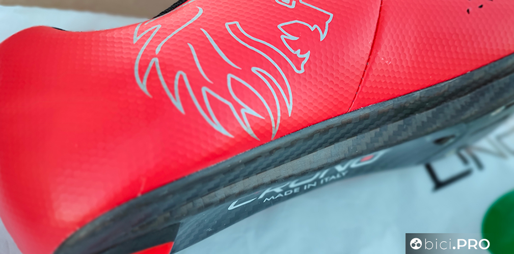 La suola tutta in carbonio ha un’indice di rigidità pari a 10 nella scala Crono ed è dedicata alla fascia di calzature al top del listino. E’ una suola lineare, dal fronte verso il retro e viceversa. Non adotta delle curvature e arcuature particolari, dettaglio che le permette di adattarsi a tutte le tipologie di piede e a chi utilizza plantari personalizzati con un supporto pronunciato dell’arco plantare. Ha una sorta di asimmetria, grazie agli spessori differenziati tra la sezione centrale (più spessa) ed i bordi (più sottili). Ha degli inserti di protezione del carbonio, sulla punta e nel tallone. La zona deputata alla tacchetta ha tre fori con un’ampia asola di scarrellamento (quasi 1 centimetro! È tantissimo ed è un bel vantaggio). Inoltre è presente il punto di memoria per il fissaggio delle tacchette Look.