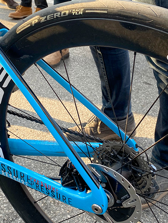 La fibra composita, quantomeno la finitura esterna, richiama da vicino la C-Lux usata per le versioni WTO. Il carbonio ha quella livrea unidirezionale e lucida. Il cerchio è tondeggiante, panciuto ed è montato con i Pirelli Race da 26, versione copertoncino e si vede la valvola delle camere d’aria Pirelli in poliuretano (quelle da 35 grammi a camera).