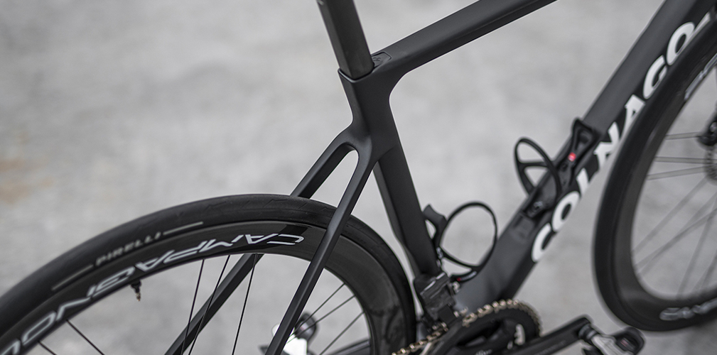 Sette taglie: 42 e 45,5, 48,5 e 51, 53 e 55, 57. Dalla taglia 42 alla 51 il rake della forcella è di 47, dalla 53 alla 57 è di 43 millimetri. L’unico valore in comune a tutte le taglie è la lunghezza del carro posteriore di 408 millimetri. A parità di misura, in un ipotetico confronto con la V4Rs, la nuova Colnago presenta degli angoli di sterzo e piantone più dritti/verticali, a favore di un avanzamento della posizione del ciclista verso l’avantreno.