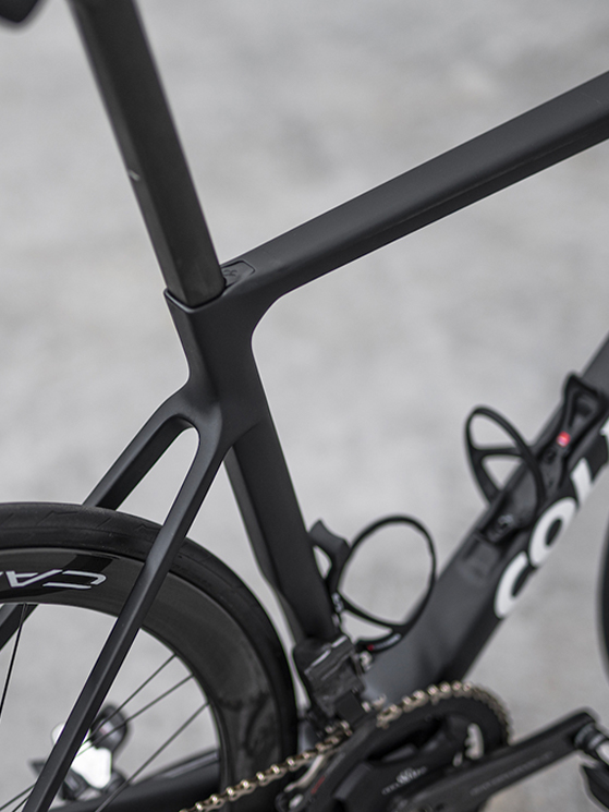 Rispetto ai normali canoni sono stati rialzati i foderi posteriori ed il punto di transizione del tubo verticale, verso la scatola del movimento, ha un raggio ottimizzato. La parte inferiore della scatola centrale è il naturale ingresso della batteria Shimano Di2, poi alloggiata nel profilato obliquo.