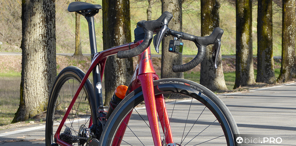 L’head tube quasi piatto frontalmente e la sagomatura dell’orizzontale La colorazione non è quella Team Replica, ma accattivante e ben fatta In gara l’abbiamo utilizzata con la GoPro Al traguardo di Colla Micheri, arrivo storico della manifestazione amatoriale (foto Sara Carena)