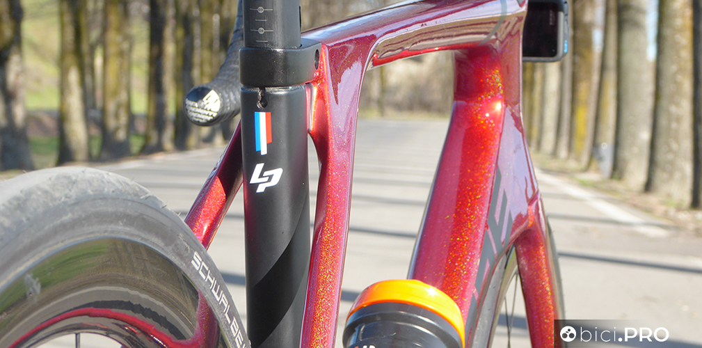 Questa è una bicicletta progettata per andare veloce, senza se e senza ma. Nella costruzione ricoprono un ruolo fondamentale le ricerche eseguite per il modello da crono Aerostorm di Lapierre, quella del campione europeo in carica. Si tratta di un monoscocca in carbonio che in questo caso adotta un blend di tessuti compositi HM (T800, T700 e 40T) che contribuiscono a fermare l’ago della bilancia a 975 grammi (dichiarati).