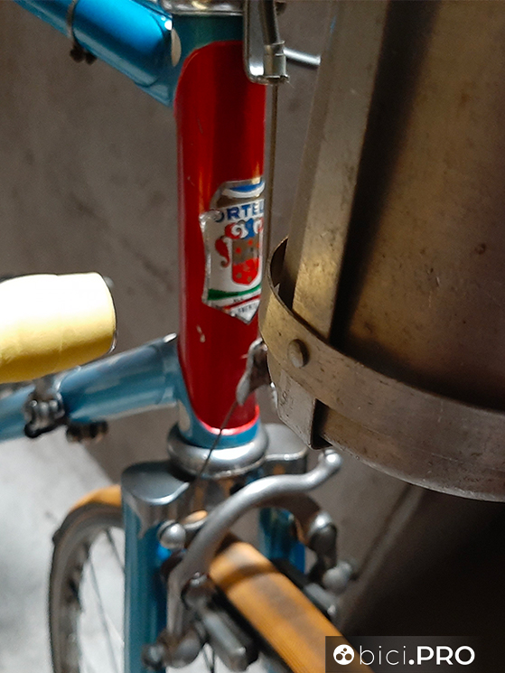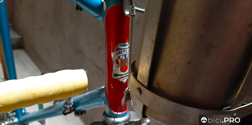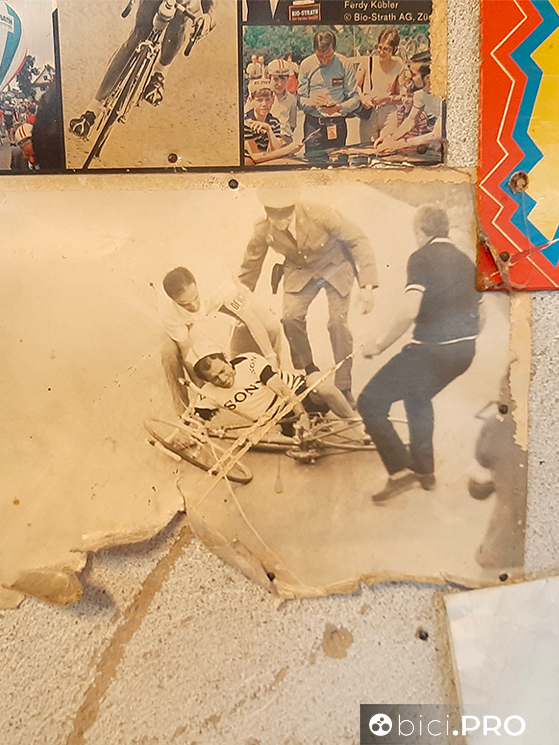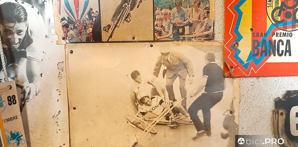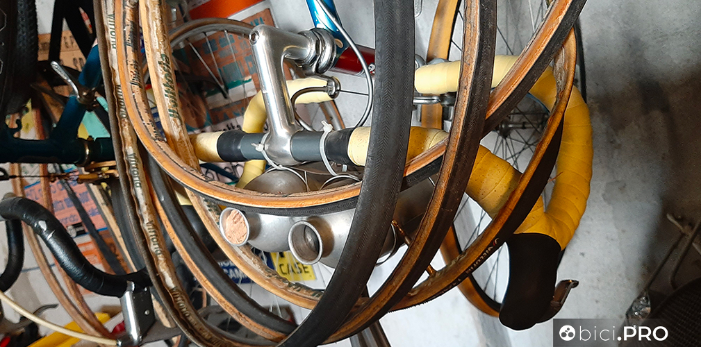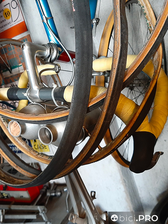 Ci spostiamo da un lato all’altro dell’officina guidati dalla sua voce, tenendo un occhio chiuso per volare con l’immaginazione e un’altro aperto per non inciampare nei cimeli. Tra questi ci imbattiamo in una Wilier di Juan Manuel Gárate.