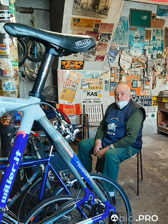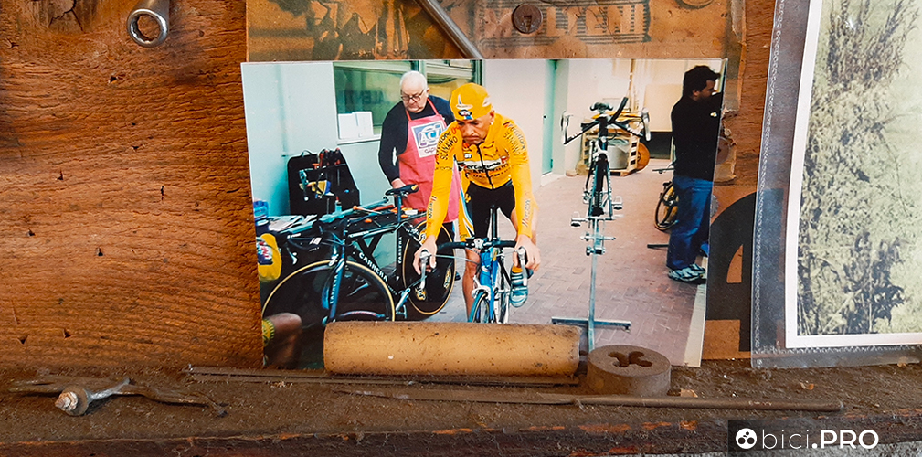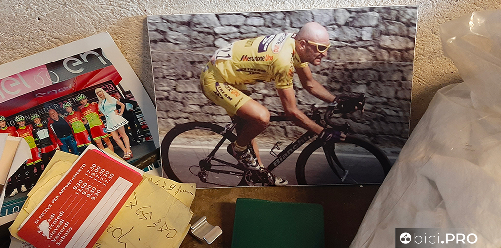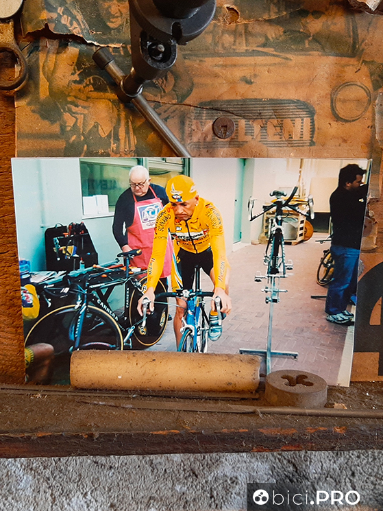 Dino ci apre nel suo fantastico laboratorio situato nel centro del piccolo paesino di Barbiano, in provincia di Ravenna. Terra romagnola proprio come quella di Marco e di altri atleti conterranei con cui ha condiviso successi e sconfitte come: Vito Ortelli, Aldo Ronconi, Marino Amadori, Fabiano Fontanelli, Roberto Conti, Davide Cassani e molti altri sparsi qua e là tra salite, piadine e cappelletti.