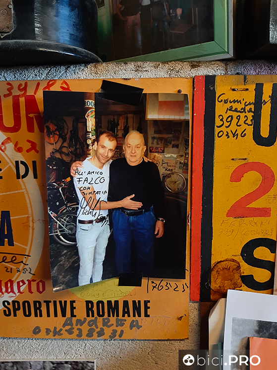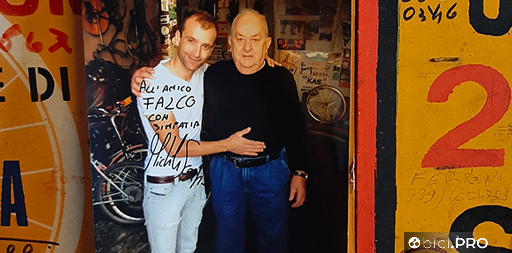 Una foto in particolare ci colpisce. Falconi ha indosso il suo immancabile grembiule da meccanico (anche oggi lo porta). Pantani è in sella alla bici.