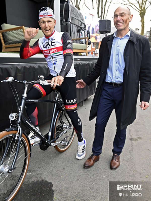 Le premiazioni in effetti sono andate parecchio per le lunghe. Jean Luc Vandenbroucke – ex professionista, direttore sportivo, commentatore televisivo, organizzatore della corsa e zio dell’indimenticato Frank – ha posato con lui in sella a una biciclettona da passeggio (foto in apertura).