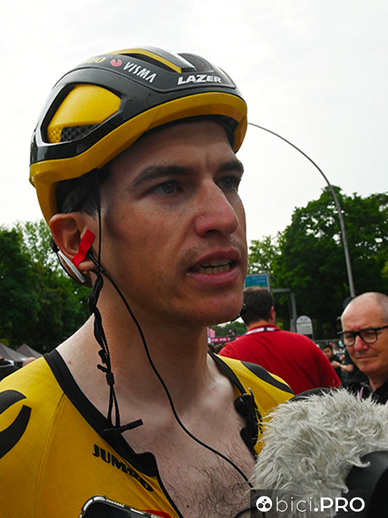 Alle interviste il corridore ventunenne olandese arriva con comodo, in tuta e scarpe da tennis, dopo essersi sottoposto all’antidoping, Poi però, una volta arrivato, è gioviale e disponibile.