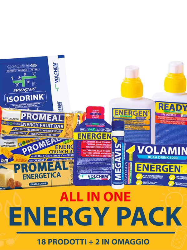 Volchem, con la confezione Energy Pack, mette a disposizione di tutti un cofanetto esclusivo che permette di provare alcuni gusti di tutti gli integratori indicati per le attività aerobiche. Un kit di prima energia da testare in ogni situazione e necessità.
