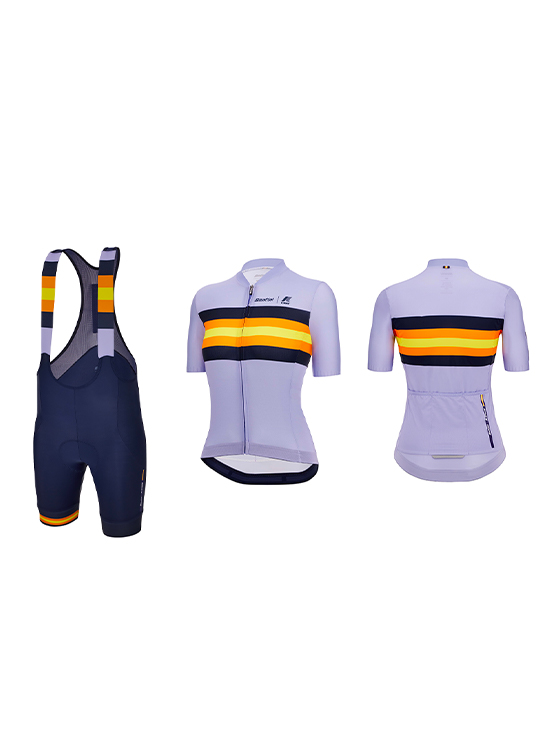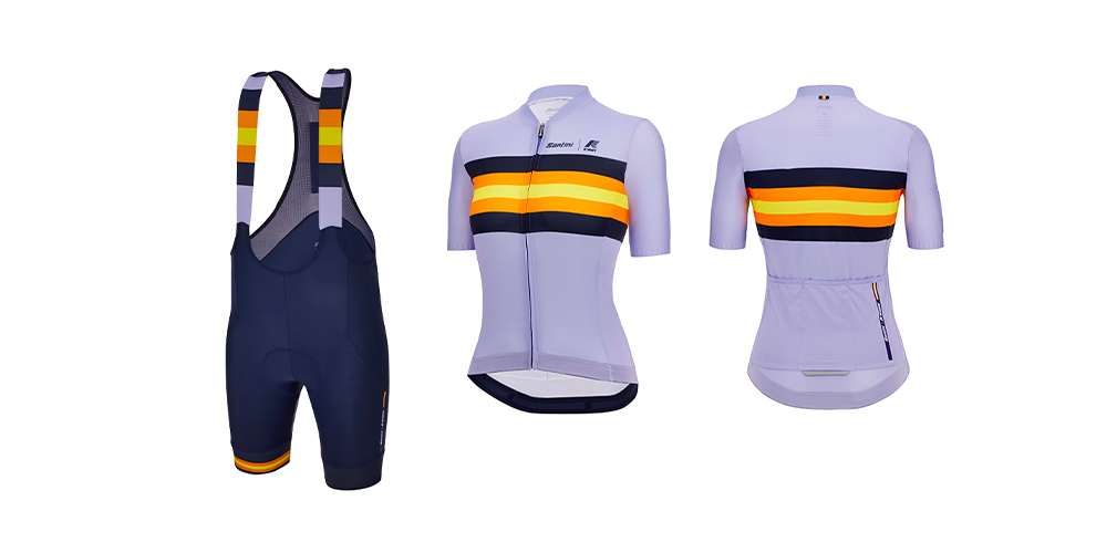 Per il completo donna firmato Santini K-Way la scelta cromatica è caduta sul lilla, uno dei colori trend della stagione primavera/estate 2023. La maglia è realizzata in tessuti eco-friendly, cioè 100% con filati riciclati che provengono da PET e filati di scarto. Il fit scelto dai designer è sleek, per una vestibilità molto aderente. Le maniche e il collo sono tagliati al vivo, e la zip centrale è coperta. Il prezzo è di 129,90 euro.