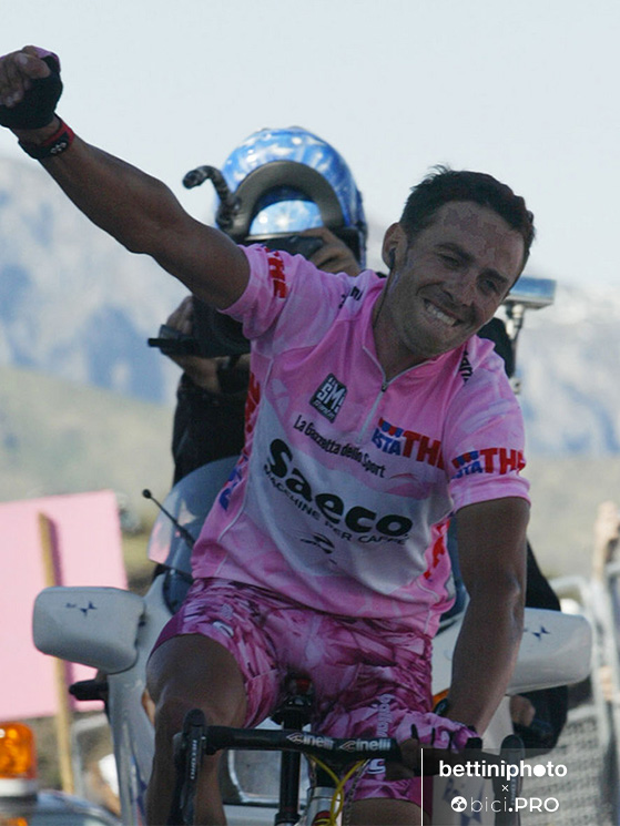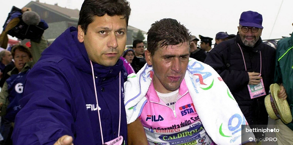 Nell’ammiraglia della Saeco che sta per vincere la tappa e il Giro con Simoni, Martinelli fa il tifo per Marco. Ci sono moto ferme con la frizione bruciata, Pantani che scatta e Garzelli che risponde. «Col cazzo che mi stacchi!» E così vanno avanti insieme.