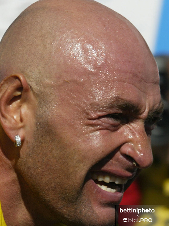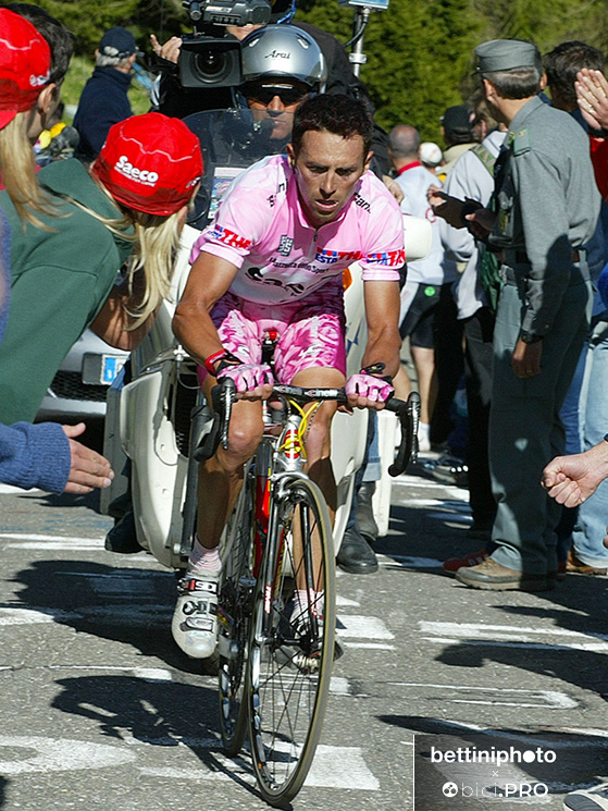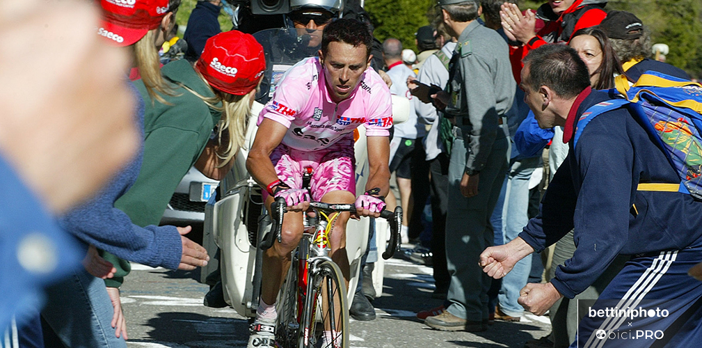 Simoni ha la faccia da duro, bruciata dal sole. Alla partenza, il suo vantaggio su Garzelli è di appena due secondi. La maglia è ancora appesa a un filo e Gibo è più che mai deciso a difenderla fino alla morte, dopo quello che è successo l’anno prima con la storia delle caramelle colombiane. Sono anni di ciclismo insolito e questa volta il trentino non vuole correre rischi. Per cui all’inizio di quella salita così dura, prende il largo lasciando gli altri dietro a litigarsi l’osso.