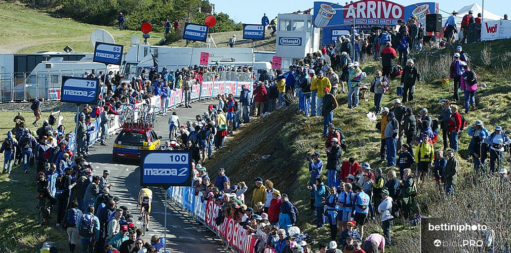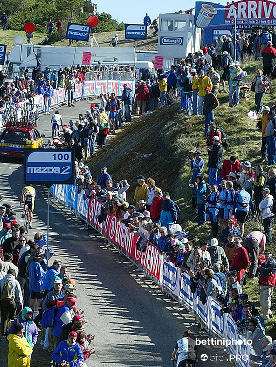 Simoni sale seduto. Si alza solo a tratti, ma tiene l’andatura costante. Dietro Garzelli e Pantani danno di gomito e ancora più indietro ci sono Casagrande e Popovych. Vanno così piano che l’ultimo chilometro sembra lungo un’ora. Il tornante più ripido prende la strada e la solleva brutalmente di una ventina di metri. C’è folla da curva nel derby e quando lo speaker grida che nel gruppo della maglia rosa c’è anche Marco Pantani, l’attesa esplode con un fragore possente che scuote la montagna. I tifosi lo vedono passare, lo incitano stupiti e poi si guardano come a dire: «Hai visto chi era?».