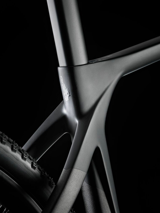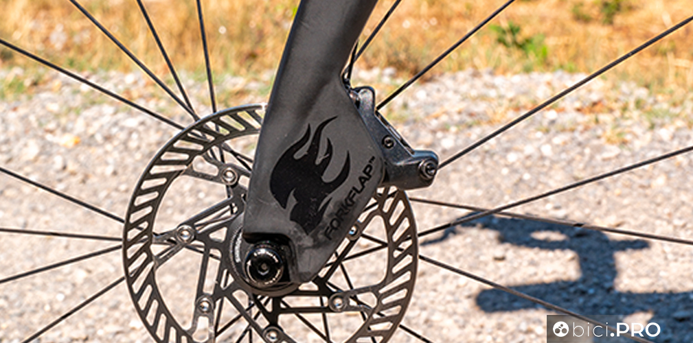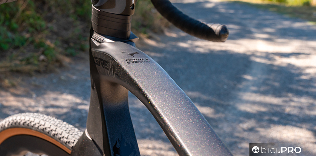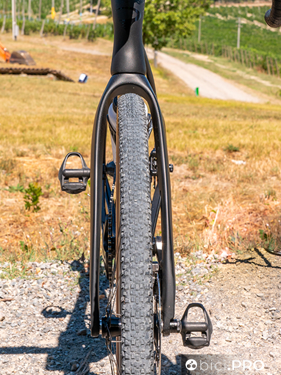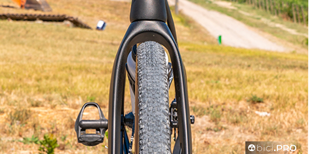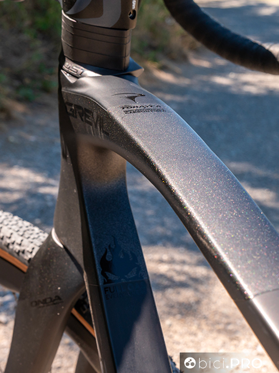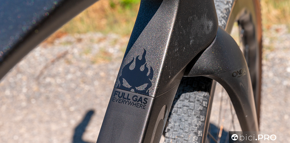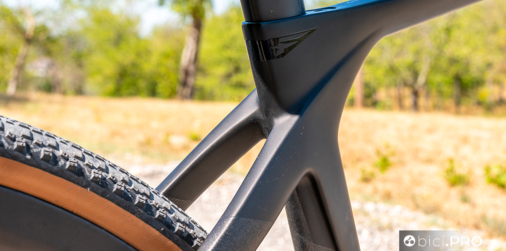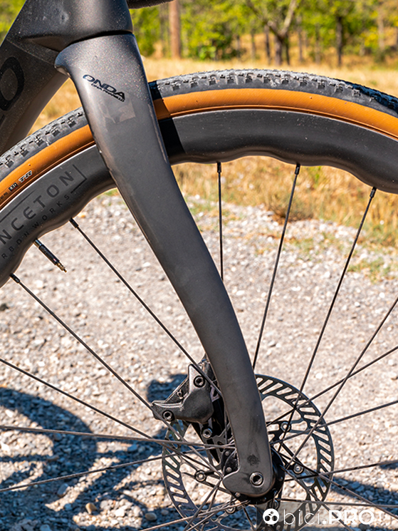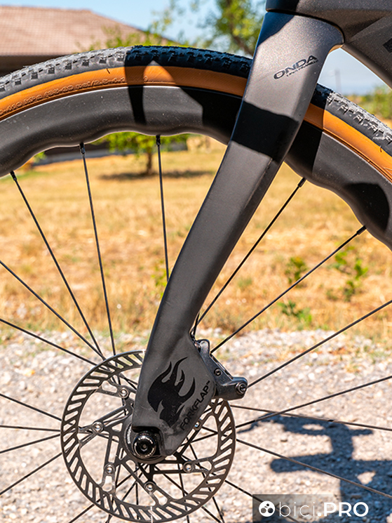 La forcella: il design è una sorta di family feeling Onda, certamente aerodinamica, ma con l’obiettivo di essere anche efficace in ambito off-road. La luce è abbondante, tra il passaggio dello pneumatico e la testa. Qui si possono montare coperture fino a 2,1” (con ruote 650b). Non un cavo, non una guaina passano all’esterno e nonostante questo lo sterzo gira senza blocchi e senza frizioni. Belli e utili i perni passanti con la leva di estrazione a scomparsa, per forcella e carro.