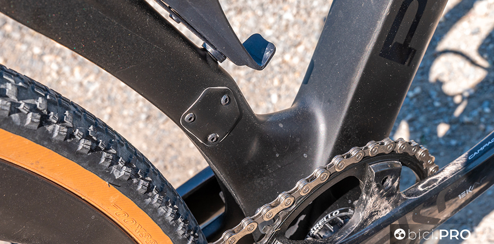 Si può montare la doppia con il deragliatore (foto Matteo Malaspina) I foderi del carro sono un tutt’uno con l’obliquo (foto Matteo Malaspina) L’innesto dei foderi al piantone tramite un’asimmetria (foto Matteo Malaspina) Quella maggiorata che protegge la pinza (foto Matteo Malaspina) La piccola aletta della forcella (foto Matteo Malaspina) Ampio il passaggio per la ruota (foto Matteo Malaspina)