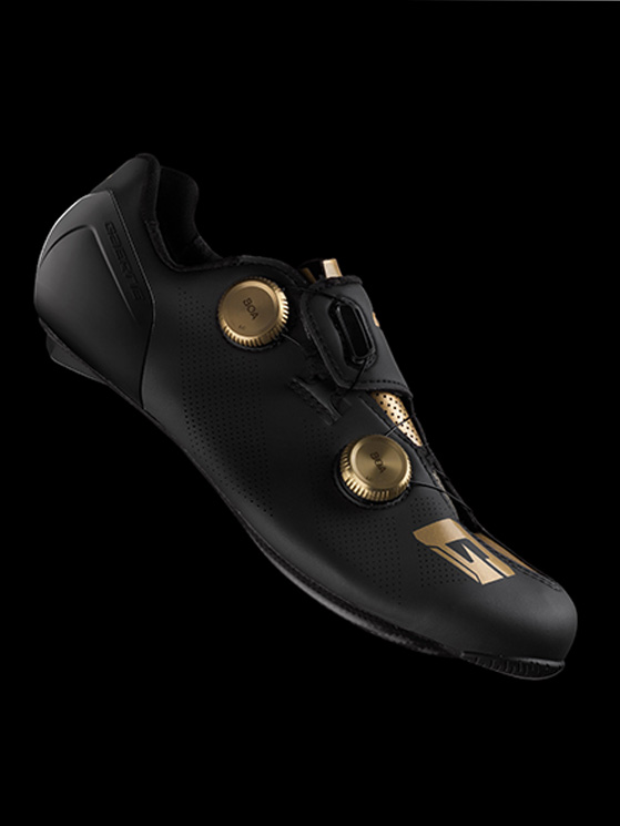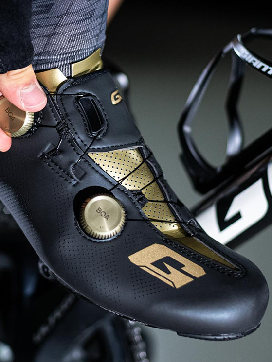 La tomaia forata con il laser di queste uniche calzature è realizzata mediante l’impiego di un unico panno di microfibra di altissima qualità. Una microfibra prevista in un’inedita sfumatura “matt black”, dunque opaca, che esalta perfettamente ed in maniera molto elegante sia la finitura oro posta sulla linguetta Fit Tongue 1.0, quanto il logotipo Gaerne e il celebre marchio della grande “G”. Non potevano poi che essere estremamente confortevoli le nuove G.STL Gold Rush: e questo lo si deve in modo particolare alla previsione della chiusura micrometrica Boa Li2, che contribuisce a ridurre lo spessore del 20 per cento rispetto al già collaudato sistema IP1, e che tramite i rotori in alluminio anodizzato – rivestiti d’oro per l’occasione… celebrativa – garantiscono alla calzatura stessa notevoli benefici in termini di stile ed eleganza, senza naturalmente trascurarne performance e funzionalità. Le micro scanalature ricavate lungo tutta la circonferenza utile del rotore Boa Li2 assicurano al ciclista una regolazione rapida della calzata, precisa e sicura in qualsiasi condizione atmosferica.