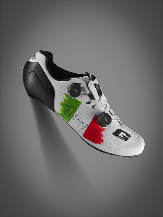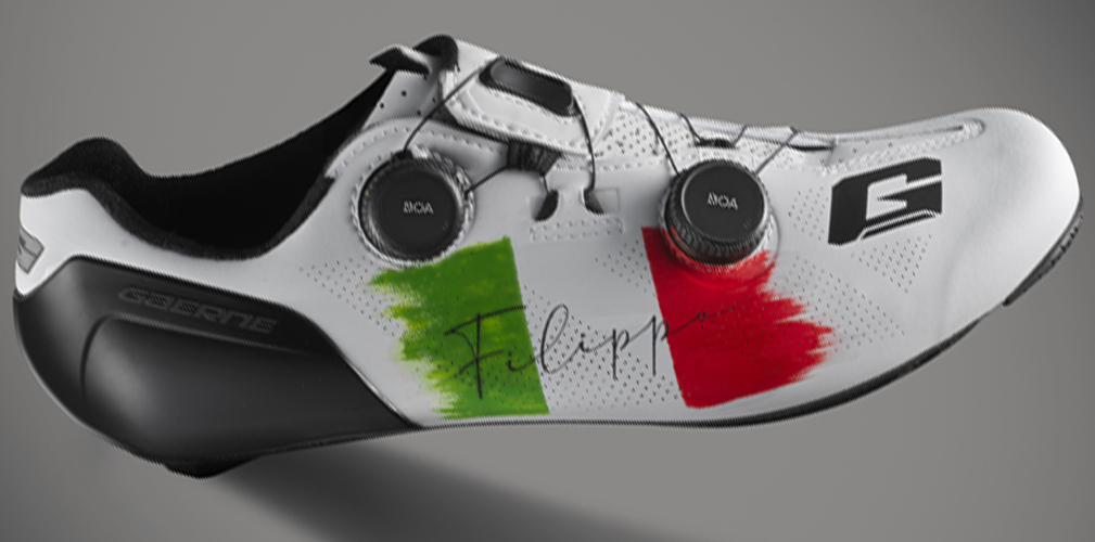 Come anticipato, le nuove Gaerne Carbon G.STL di Filippo Zana sono dipinte a mano dall’artista Morris Spagnol. Nella parte laterale della scarpa il nome di Filippo è stilizzato all’interno dalla bandiera italiana, dove il tricolore sfuma per creare un effetto di velocità. Gaerne, che quest’anno celebra i 60 anni d’attività, ha così voluto omaggiare Zana con una scarpa personalizzata: una versione unica del modello utilizzato in occasione della vittoria al campionato italiano e con il quale il corridore vicentino ha sviluppato in questi anni uno speciale feeling.
