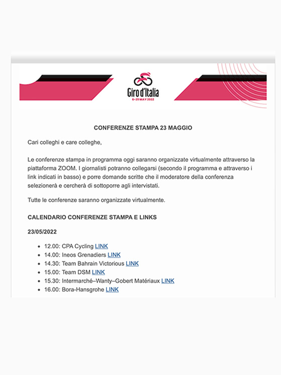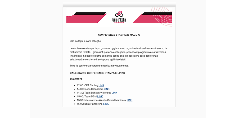 Ecco la mail con i link per le conferenze stampa di oggi. Anche chi è a casa può accederviEcco la mail con i link per le conferenze stampa di oggi. Anche chi è a casa può accedervi